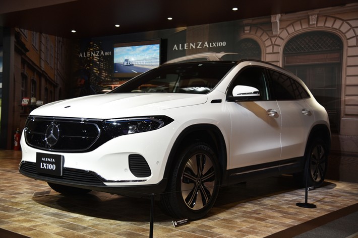 ポテンザRE-71RSを装着したタイムアタック車両のGR86を展示するなど、スポーツ色の強い印象だったブリヂストンブース。だが奥に進むと一転して落ち着きのある空間に。そこに展示されていたのは、ALENZA(アレンザ)LX100を装着したメルセデス・ベンツEQAだ。