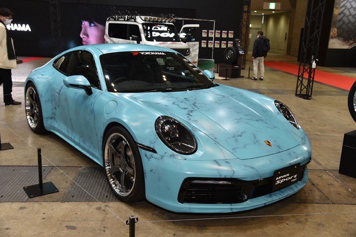 フルラッピングしたポルシェ911カレラが装着するタイヤは、欧州プレミアムカーにも純正採用されているアドバン・スポーツV107(245/35ZR20:305/30ZR21)。ドイツ・ニュルブルクリンクで鍛えられたアドバンの精神を継ぐ、YOKOHAMAの新たなグローバルフラッグシップタイヤだ。