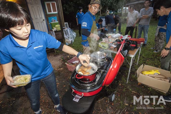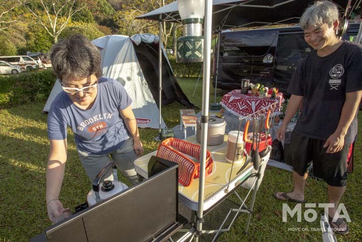 天候がどんどん回復し、各ファミリーがサイトの準備に余念がない中、オートキャンプのメインイベントといえば自分たちのスタイルを駆使しての夕食タイム。普段はママに任せっきりだというパパたちがこの日ばかりは先頭に立って自慢の料理を大披露(じゃないパパさんたちもいましたが。笑)。