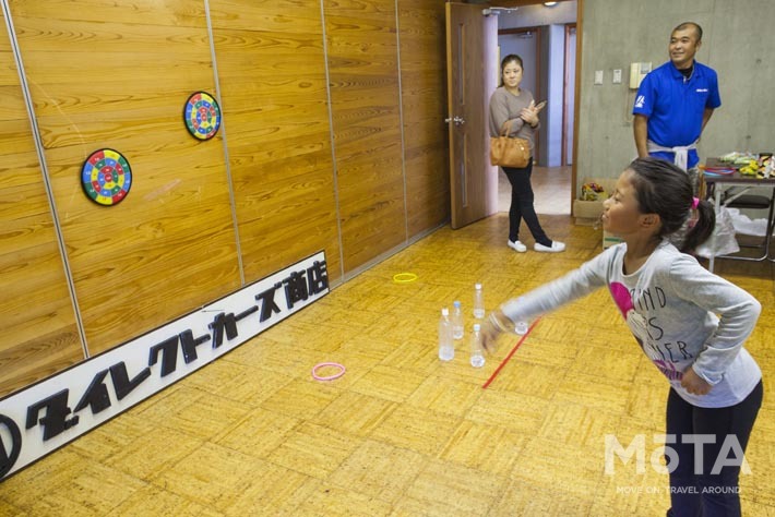14時の集合時間には大雨だった天候も15時を過ぎればなんと晴れ間が! 本来なら借り物競走や玉入れ、綱引きといった「運動会」が予定されていたのですが、今回はあいにくの大雨からのイベントスタート。だから予定していた芝生の上もビッチャビチャなので急遽予定を変更してキャンプ場の空き部屋をお借りしてのボーリング、輪投げ、ダーツ遊びとなりました。子どもたちは、景品のお菓子をゲットしようと気合いを入れて投げていましたよ!