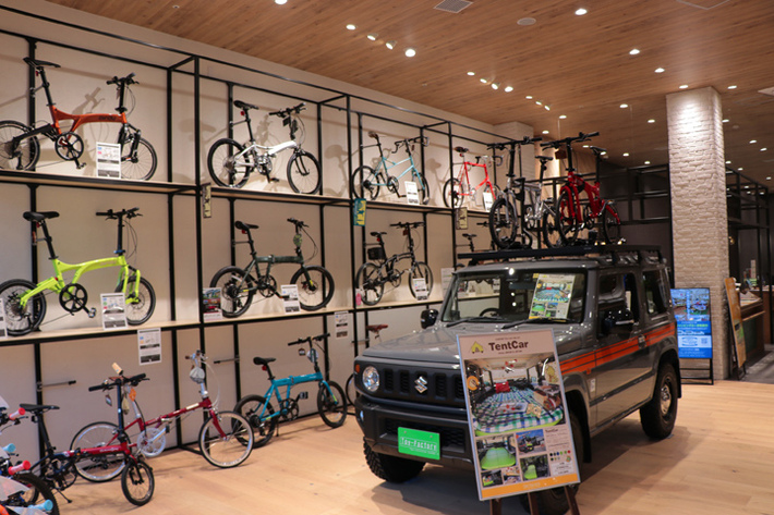 今回はどんな狙いがあってキャンピングカーのアンテナショップ×ミニベロ専門店を作ったのか? キャンピングカーとミニベロがよく売れているとのことで、そのワケを探ってきました。集客の秘訣は入り口に置かれたN-VANとジムニー・・・? ミニベロを置いたことでキャンピングカーが売れている・・・?