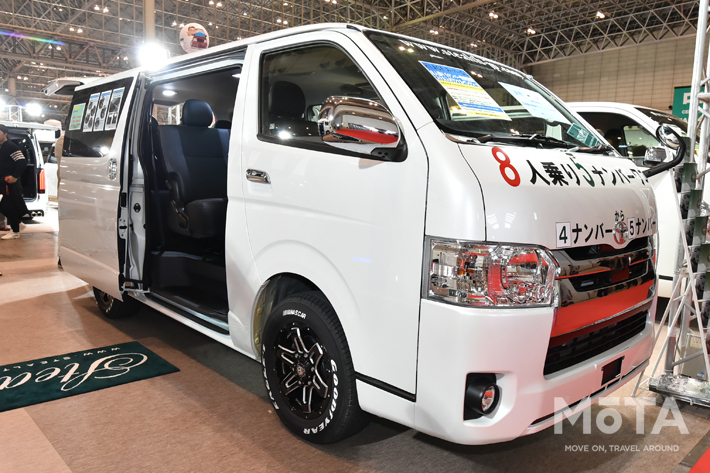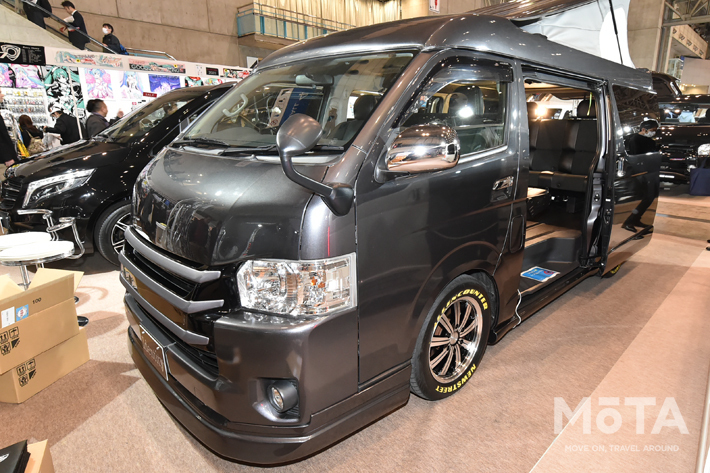 ハイエースを乗用車登録する先駆者であるステルスでは、さまざまなレイアウトのハイエースを展示。