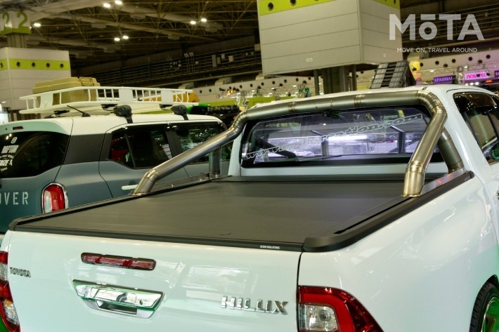 SPD Creation(エスピーディークリエーション)からは、ハイラックスのピックアップ(GUN125)をベースにした「SPD First」が登場。前期型ブラックラリーバンパー専用に仕上げたエアロキットにFMT製のフルエアロに、純正ガッツミラーの取り付け穴を隠す後期型専用ライトカバーを装着し、スポーティなムードを演出していた。