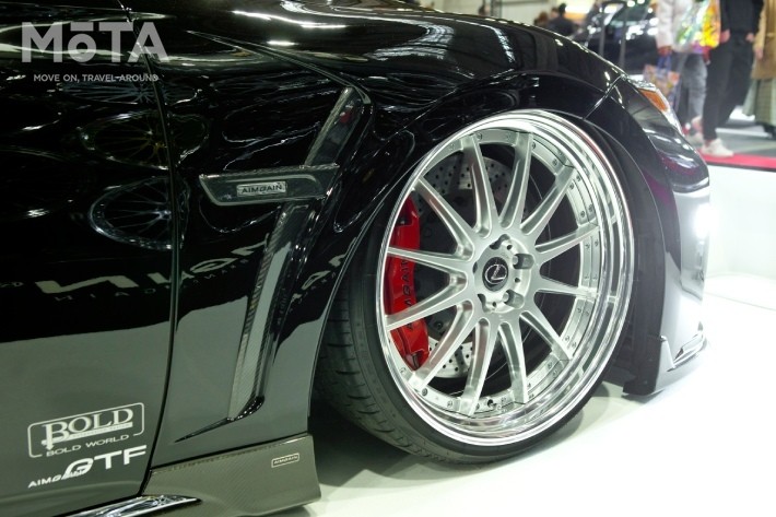 フットギアは、エイムゲインのGTF(F:22×10.0J/R:22×11.5J)を装着。放射状に広がる極細12本スポークとステップリムをマッチング。フェンダーに被らせるマッチングにより、さらにその存在感を高めていた。写真のハイパーシルバーを含め、全7色のディスクに、ソリッドリム5色/ダグリップリム9色と豊富なカラーバリエーションを用意。至高のVIPスタイルに仕立ててくれる。