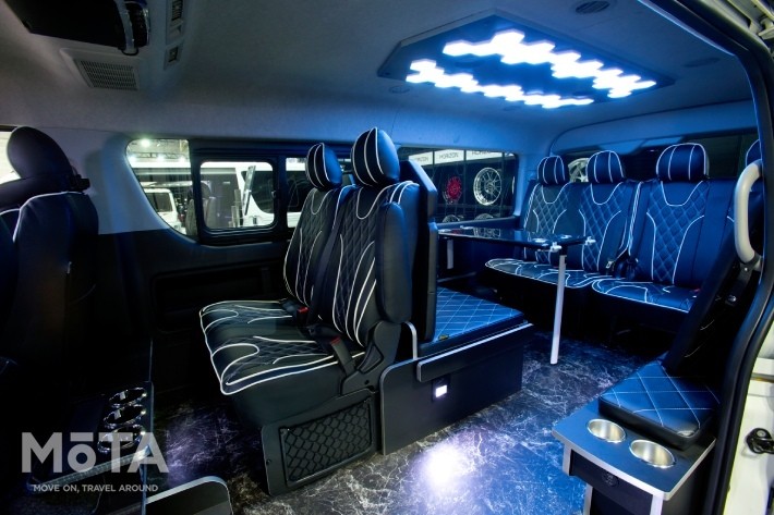 写真のインテリアパッケージは、10人乗りのワゴンGLをベースにした「WB8」。乗車人数はそのままで、3列目シートを後ろ向きにしてマットをプラスするだけで、広々としたベッドスペースに変身。3列目シートやベッドを収納し、4列目シートを両サイドに跳ね上げれば、広々としたラゲッジスペースまで手に入るというパッケージだ。会場では、天井シーリングライトとダウンライトをセットにしたWB8ロイヤルサルーンが展示されていた。