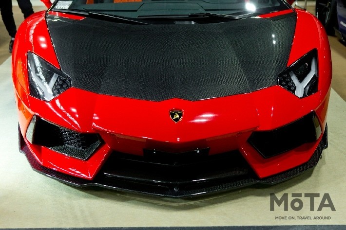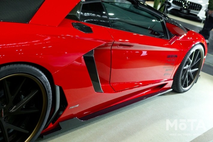 出展車両のなかで注目したのが、レッド×ブラックカーボンのコントラストが美しい先代のアヴェンタドール・ロードスター。先鋭的な顔立ちを演出するフロントスポイラーVer.2に、ボトムラインを整えるサイドスカート、レーシーなバックショットに仕立てるリアウイング&エクステンションスポイラー。このほかドアミラーカバーやサイドダクトカバーなど、細部に渡って質感の高いカーボン柄でコーディネイト。アヴェンタドール・ロードスターをさらに躍動感のあるスタイリングに仕立てていた。