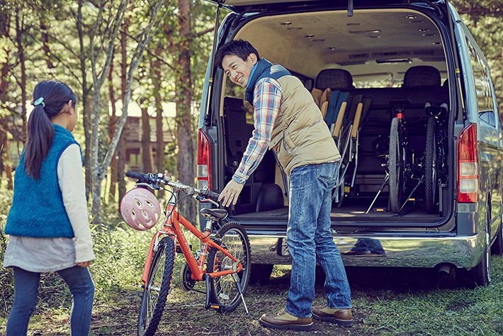 ワイドボディのハイエースがベースのコーストラインは、抜群に広い室内を備えています。そのスペースをたっぷりと活用できるので、ギアの多いアクティビティでも安心。キャンプ道具もいっぱい積むことができます。