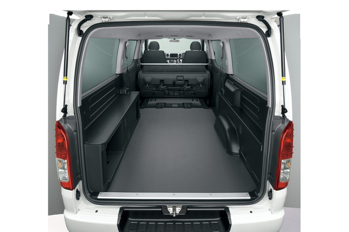 床は専用のフラットなロンリウム(硬質塩ビ)フロア仕上げで、水や汚れにも強い。耐荷重50kgのアンカーナットも備える。荷室長はリアシート展開時1855mm、リアシート前倒時には3000mmもの空間を確保するから、オートバイを積んだりすることも可能だ。