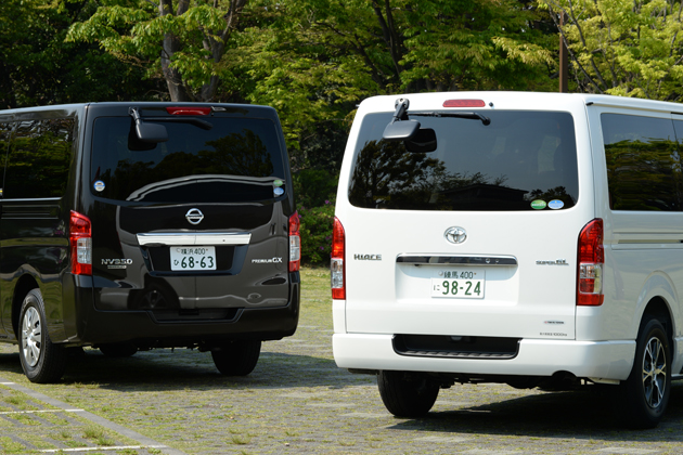 日産 新型 NV350 キャラバン「プレミアムGX」ロング 標準ルーフ(左)は、ハイエースを徹底的に研究して登場した。それに応えるかのように、2013年11月のビッグマイナーチェンジを実施し、王者の風格をみせるハイエース!(右)