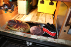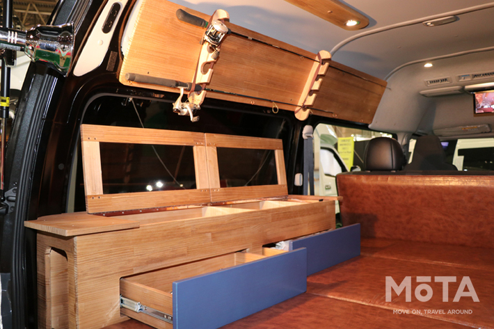 シャワー用ポリタンクとサブバッテリーが標準装備されているので、釣りから戻ってきたらその場で魚を洗うこともでき、収納式テーブルと組み合わせれば、本格的な調理だって可能です。