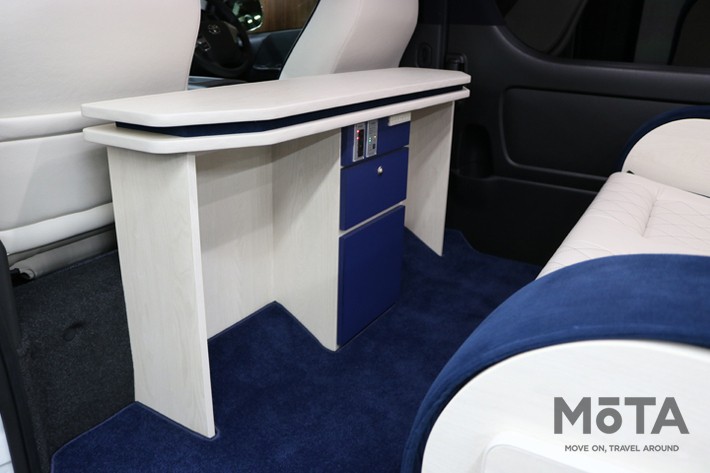 そのハイエースバンが、まるでショーファーカーのような室内空間に仕上がっています。それでいて、快適な車中泊を可能とするベッドキットなどを装備。2つの要素をシャープにまとめたインテリアに注目です。