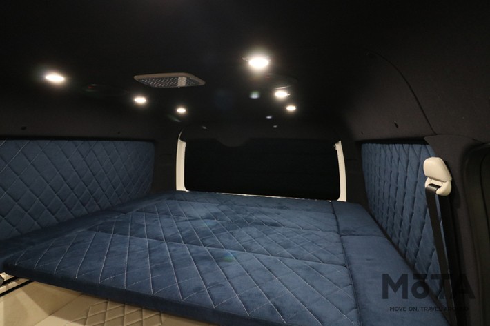 リムジンのような車内ですが、マリブは車中泊を快適にするために作られたキャンピングカーです。ベッドや水回りのセット、大きな収納スペースも用意されています。