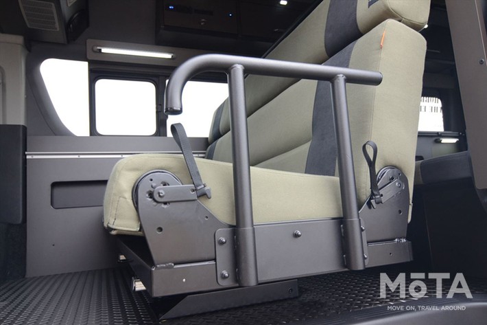 全ての座席やベッドの表皮には、ミリタリーテイストを高めるオリーブグリーンシートを採用。こちらはレクビィオリジナルの難燃帆布で縫製されており、高い耐久性・撥水性を備えています。セカンドシートの左右にはアイアンのアームレストが装着されており、さらにミリタリーテイストを高めています。