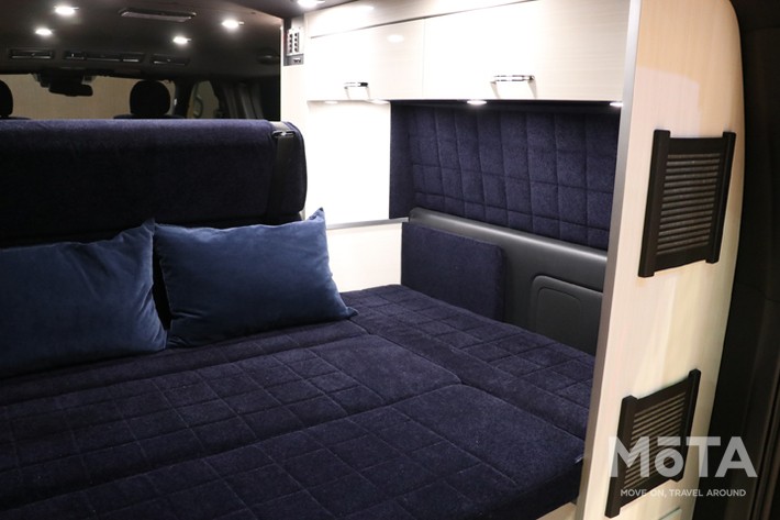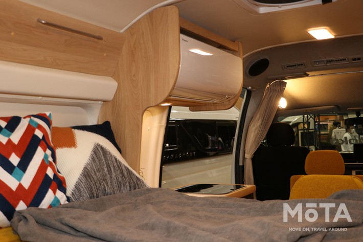 リアのベッドスペースも分割されたムードを持ち、バンコンの内装とは思えない雰囲気を作る。それだけでなく、シートアレンジによって後部にフルフラットのベッドスペースが作れる実用性も兼ね備えている。