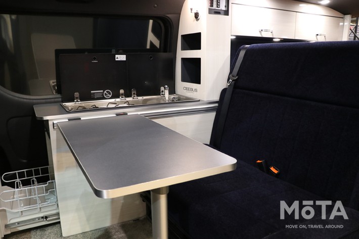 展示車両の中でもひときわオーラを放っていたのが「シーバス」。コンセプトはキャブコン並みの設備をバンコンで実現すること。しかもベースはハイエース・標準ボディなのも見どころ。