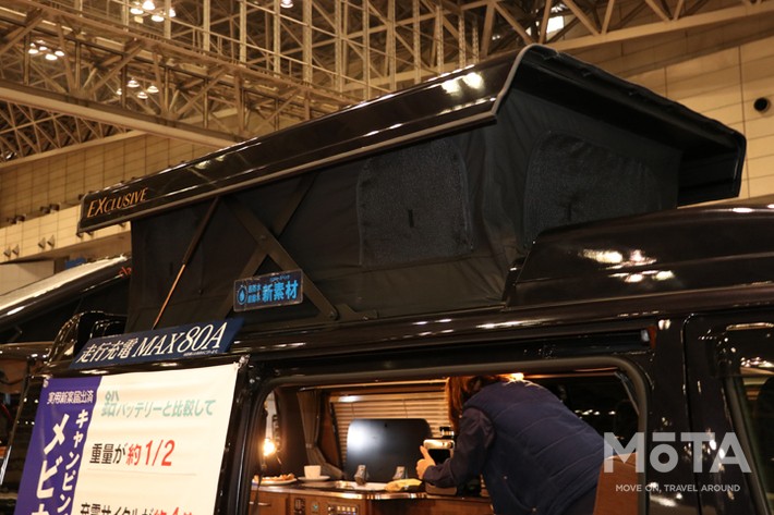 ブースで一番目立つ場所に展示されたのは「オーロラ エクスクルーシブ」。ハイエース初とうたわれるエレベータールーフを装備しているのが最大の特徴だろう。
