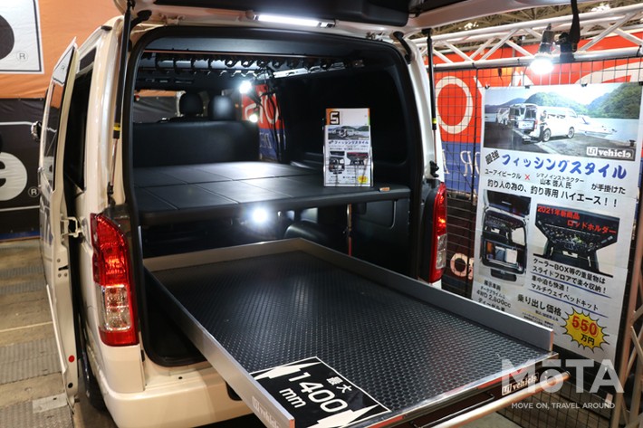 ショー会場に展示されていた釣り仕様のハイエース、基本となるのは快適車中泊パッケージで室内装備としてはマルチウェイベッドキットや防虫ネットや遮光パッドなどの装備、さらに足回りにはオプティマリーフやコンフォートショック、前後のスタビライザーを備えた乗り心地を改善。その上でシーリングにロッドホルダーと荷室へのスライドフロアの設置によって快適な釣り仕様を作った。
