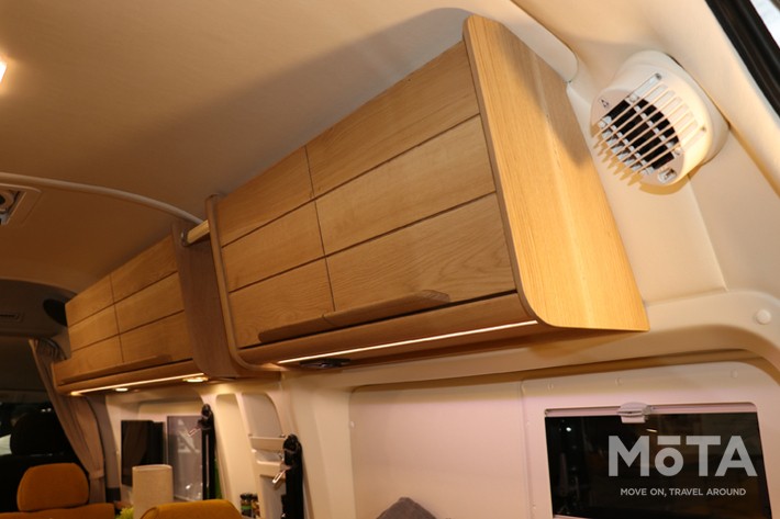 従来のポップアップルーフとは異なり、ルーフが真っ直ぐに上がる構造なのでスペース効率が良く、車内の広さが際立つ。室内高は実に1850mmを確保するため大柄な男性でも立って移動ができる余裕がある。またテント部分には防水素材を用いているので雨対策も万全。