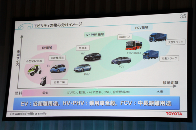 トヨタでは、航続可能距離や充電インフラの普及を考慮し、EV(電気自動車)は近距離用とし、HV(ハイブリッド)・PHV(プラグインハイブリッド)を乗用車全般、FCV(燃料電池自動車)を中距離用途と考えている。