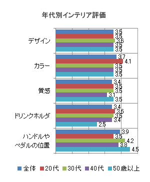 ただし、50歳以上(今回は2名)の方は、ドリンクホルダ「2.5点」、ハンドルやペダルの位置「4.5点」など、優越をハッキリと主張している。これも、「無難」に対する裏返しの評価だと思う。