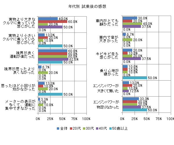 「視界が良く、運転が楽だった」は平均60%だが、これもミニバンとしては最低条件だ。その他の設問では、各年代で結構な散らばりがある。