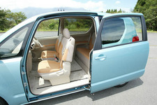 左側のドアを大きなサイズの電動式。いっぱいに開くと前後のシートに同時に乗り込めるくらいの開口部が開く。床面は地上から300mmと低いので、老人や子供なども小さなステップで乗り込むことができる。さらに助手席を大きくスライドさせたり、背もたれを倒すことによって、室内には大きな空間が広がる。標準状態でも前後のシートの間隔はセルシオを上回るくらいの広さだから、ポルテの空間の広さが分かるだろう。