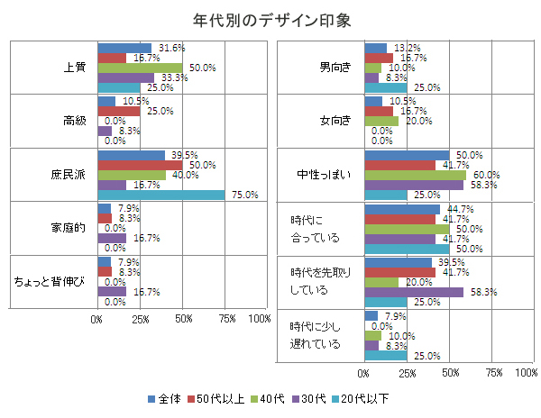年代別で見ると、40代、50代以上の中高年にウケが良い。イメージは全年代で、「庶民派」「上質」が主流。雰囲気としては、「中性っぽい」「時代に合っている」「時代を先取りしている」という先端技術を連想する人が多い。