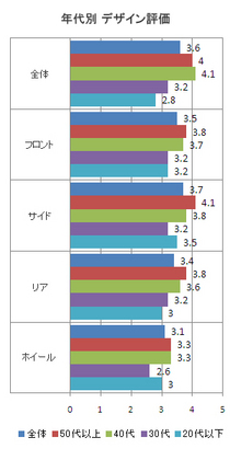 また、ボディ各所(フロント/サイド/リア/ホイール)評価ではホイールの得点が低い。特に、今回のユーザー数全体の31.6%を占める30代で2.6点と厳しい評価だ。