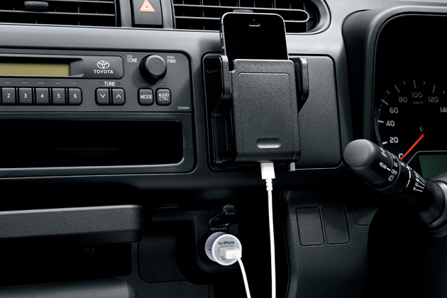 スマートフォンが収納出来るマルチホルダー。この状態では着信が来たことなどは確認できるものの、残念ながら画面を見ることは出来ない。最近はスマホ用カーナビゲーションアプリも多数用意されており使用するユーザーも多いのだが、トヨタでは安全上の理由であえてこのデザインにしたと説明する。