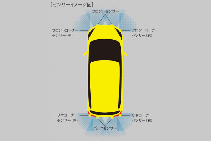 超音波センサーを使ったインテリジェントクリアランスソナー(パーキングサポートブレーキ)も設定している。低速、あるいは停車時に作動する緊急自動ブレーキだ。例えばゆっくりと前進/後退しながら車庫入れをしている時、後方の障害物を検知するとブレーキを自動的に作動させる。センサーは前後に各4箇所(合計8箇所)に装着した。