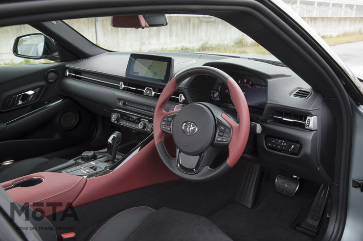 また運転席の膝まわりは、やや高さのあるセンターコンソールとインパネを繋ぐパネルにより安定した運転姿勢をサポート。コーナリング時にドライバーの体を足元から支える造形も、スープラがスポーツカーであると感じる部分と言える。