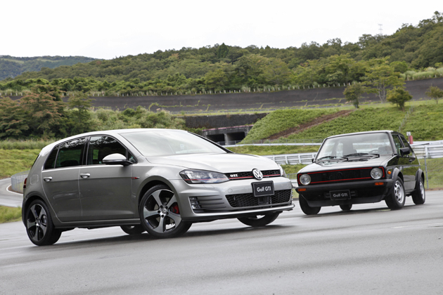 フォルクスワーゲン 新型 ゴルフGTI[GOLF7]と初代ゴルフGTI(右奥)