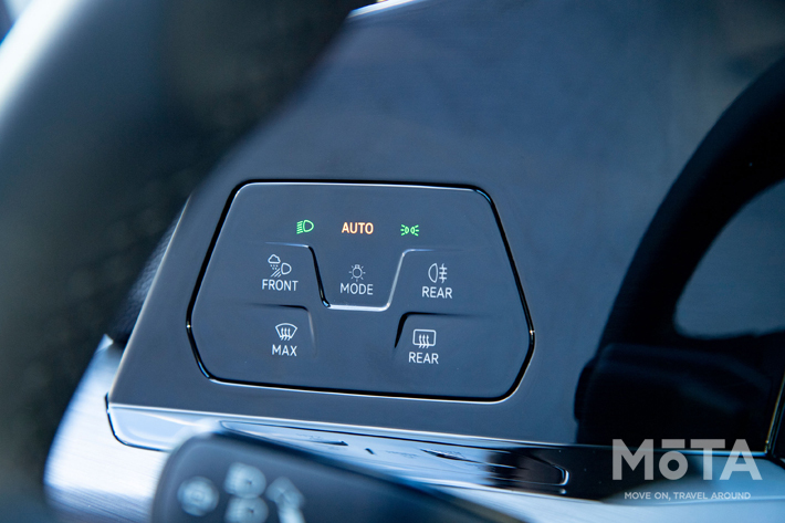 ちなみにヘッドライト関係のスイッチや、ハザード周りのドライビングモード設定その他は全てタッチ式(残念ながら押したことを振動で伝えるハプティック系ではない)になっており、極めつけはエアコンの温度調整やオーディオのボリュームがタッチかつスライドで調整する方式となっていたこと。つまり指をおいて撫でると温度の高低やボリュームの大小を調整できるのだ。
