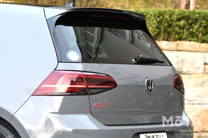 エクステリアはフロントリップスポイラー/サイドスカート/リアデュフューザーなどの専用パーツ(ブラックペイント)や専用デザインのアルミホイール(マットブラック)、更にサイドのTCRのデカールにより、明らかにノーマルとは異なるオーラがプラス。ボディカラーは4色用意されるが、TCR専用色の「ピュアグレー」はGTI伝統の赤いラインの入りのフロントグリルがより際立つ。