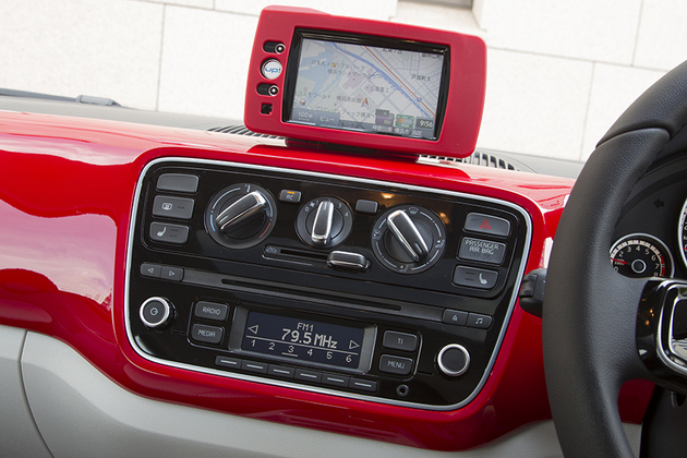 写真のポータブルナビは純正オプションのup!専用ナビゲーション(AVIC-MP33)。ボディカラーにマッチした専用シリコンカバーは別途オプションとなる。