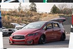 お、インフィニティからワゴン出たんだ! と思ったら、実はこちらのベース車両はホンダのオデッセイ(RB1型)というB-DASHの V37オデ。フロントマスクにはインフォにティのバッジが付いているし、ボディカラーはMAZDAソウルレッドクリスタルメタリックと、驚きのカスタマイズが施されている!