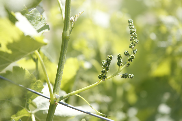 まだ若い葡萄の花穂。【注記:葡萄畑や周辺道路など、三澤農場へ一般車両・人が無断で入場することは通常全て禁止されています。本記事内の「三澤農場」「ミサワワイナリー」における画像は、全て中央葡萄酒(株)の許可を得て撮影されたものです。】