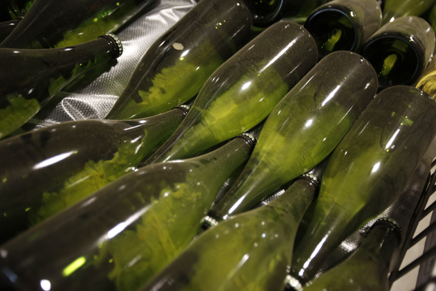 ピュピトルに並べられ、静かにエージング中のワインたち。[中央葡萄酒株式会社「ミサワワイナリー」(山梨県北杜市明野町)]