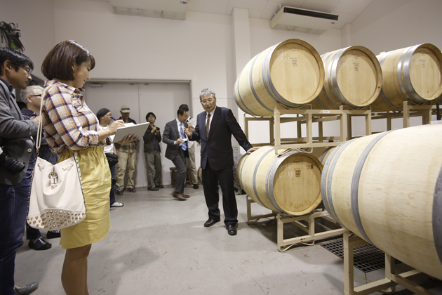 中央葡萄酒株式会社の三澤 茂計(みさわしげかず)社長自らがミサワワイナリーについて説明する。こんな貴重な機会もなかなかない。[中央葡萄酒株式会社「ミサワワイナリー」(山梨県北杜市明野町)]