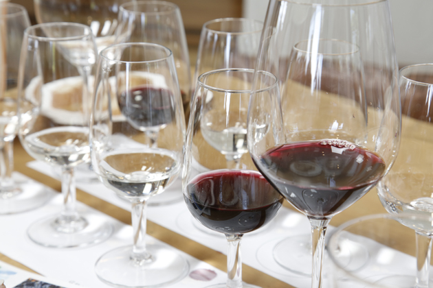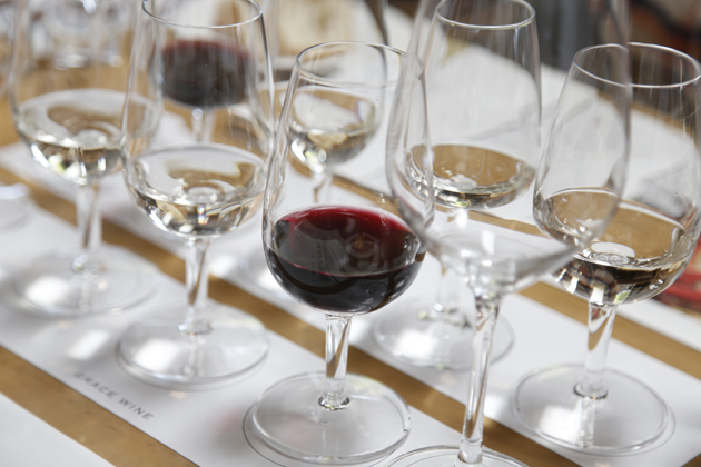 今回テイスティングした赤と白のグレイスワイン。左の「グレイス メルロ2012」「甲州 鳥居平畑プライベートリザーブ2014」はフレンチオーク樽で醗酵・熟成させたものだ。[中央葡萄酒株式会社・ミサワワイナリー「ワインテイスティングセミナー」(山梨県北杜市明野町)]