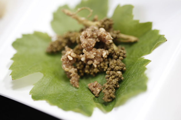 珍しい「葡萄の花穂の胡麻和え」。ワインにも良く合う滋味深い味だ。[中央葡萄酒株式会社・ミサワワイナリー「ワインテイスティングセミナー」(山梨県北杜市明野町)]