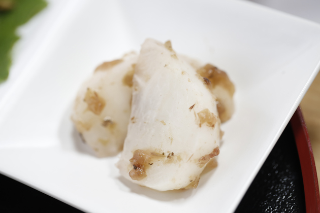 「蕪(かぶ)の梅肉和え」。カブは地元山梨・勝沼産。梅干しもマダム三澤が漬けた自家製というこだわりぶりだ。[中央葡萄酒株式会社・ミサワワイナリー「ワインテイスティングセミナー」(山梨県北杜市明野町)]
