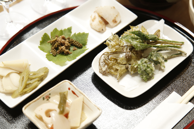 季節の野菜の天ぷらが並ぶ。奥の天ぷらはなんと「葡萄の葉」! 口に含むと、なるほどほのかに葡萄の香りが漂う。 採ってすぐでないと美味しくないとのこと。その土地に出向かなければ味わえない味覚だ。その他に「こごみ」(左)や「うどの葉」(手前の葉)などが並ぶ。[中央葡萄酒株式会社・ミサワワイナリー「ワインテイスティングセミナー」(山梨県北杜市明野町)]