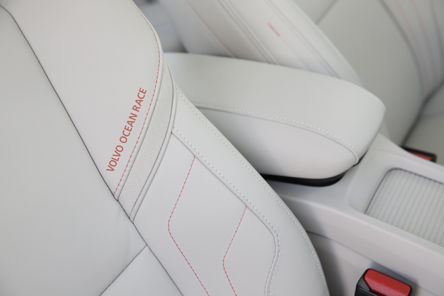 テキスタイルアクセント&オレンジカラーステッチの入った専用本革シート。[ボルボ V40 Ocean Race Edition(オーシャンレースエディション/300台限定・特別仕様車/ボディカラー:クリスタルホワイトパール)]