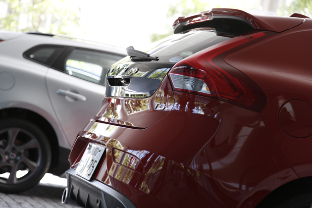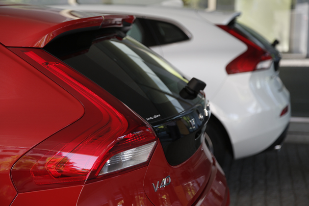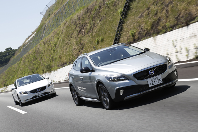 (手前)ボルボ V40 Ocean Race Edition(オーシャンレースエディション/300台限定・特別仕様車/ボディカラー:クリスタルホワイトパール)(奥)ボルボ 新型 V40 Cross Country(クロスカントリー) T5 AWD(新パワートレイン「Drive-E」/2015年モデル/200台限定/ボディカラー:エレクトリックシルバーメタリック)