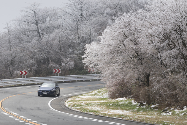 ボルボ V40 特別限定車「V40 Ocean Race Edition(オーシャンレースエディション)」[300台限定/詳細は http://autoc-one.jp/volvo/v40/launch-2133355/ も併せてチェック!]が箱根を駆け抜ける。撮影日は4月の上旬。麓(ふもと)付近は桜も散り始めだというのに、山頂付近はなんと氷点下で、木々も霧氷(むひょう)で覆われていた。なかなか見ることのできない光景である。