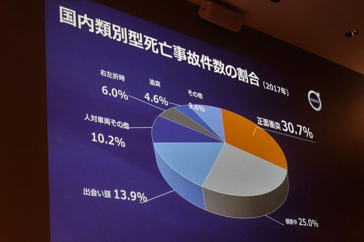 今回、新型V60から採用された正面衝突対策としての対向車対応機能にも触れ、「日本の警察庁が発表している2017年の国内類別型の死亡事故の件数割合では、正面衝突が最も大きな割合を占めています。ここをまさに解決する必要があるのです」と述べる。