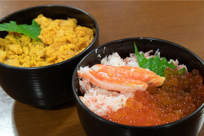 店頭には、新鮮な海産物がずらりと並び、こちらのテンションも上がる。店員さんからも「お兄さん、カニあるよ~」「ウニ、美味しいの、どう?」などと次々に声が掛かる。どうせなら今年の正月用の買い出しも済ませてしまおうか。
