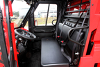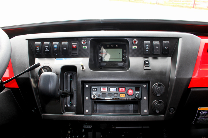 ドアは大きく開き、フロアは平らなので乗り降りは楽だ。インパネはミュールと基本的に共通で、サイレン制御ボックス、ウインカーインジケーター、ダンパ登録で必要となる後輪ロックレバーなどを追加している。メーターやスイッチはセンターにコンパクトにまとめてあり、扱いやすそうだった。