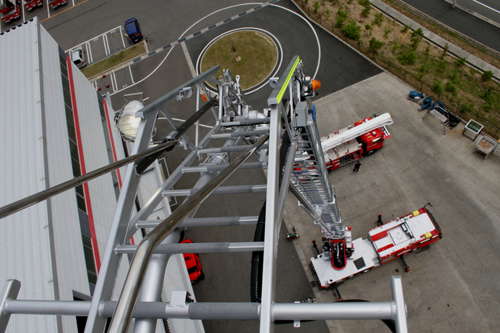 予定外の提案だったが、高所恐怖症ではないし、二度とない機会なので乗せてもらう。試乗したのはフラッグシップである先端屈折式。ヘルメットを被り、安全ベルトで体をバスケットに固定すると、音もなくはしごがスルスル伸びて、あっという間に地上30mへ。そこから先端を折り曲げたりはしごを回転したりというアクションを体験する。